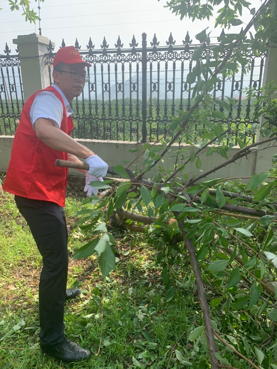 圖為志愿者合影 8月13日上午,該所志愿服務隊身穿統一紅色馬甲,積極投身到災后恢復工作中。 “把砍刀給我,我力氣大,讓我來?!?/span> 活動過程中,孫明偉、杜廣勝、楊堅等同志一行先查看了配電房周邊綠化帶,看到有樹木倒伏,壓在防護網上,存在較大安全隱患,他們二話不說立即手拿砍刀,對樹木進行切割處理,并由李學平、包德福等人安排拉車將斷木等清理干凈。
