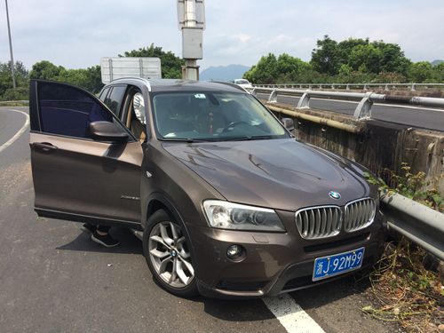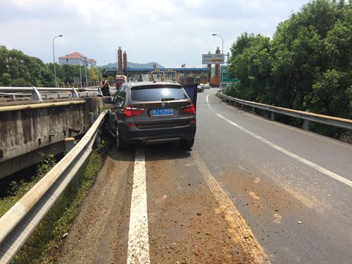 8月13日上午10:30分左右,臺州收費所出口寧向匝道口有一輛黑色寶馬X3斜靠在護欄旁,其車頭左側因碰撞護欄而嚴重凹陷,左前輪胎報廢。 當時,該所出口五號車道的欄桿發生故障,需要暫時關閉進行維修。班長張海勇在內廣場引導車輛時發現此起事故,走近細看,由于碰撞激烈該車前檔玻璃破裂,前排安全氣囊彈出,而車旁的兩個人驚恐未定不知所措。此時匝道口車流不斷,因駕駛員遲遲找不到三角牌,為避免二次事故的發生,張海勇在車后方指揮交通,并提醒車旁人員站在護欄外安全位置,同時報告指揮中心事故車的位置和損傷情況。