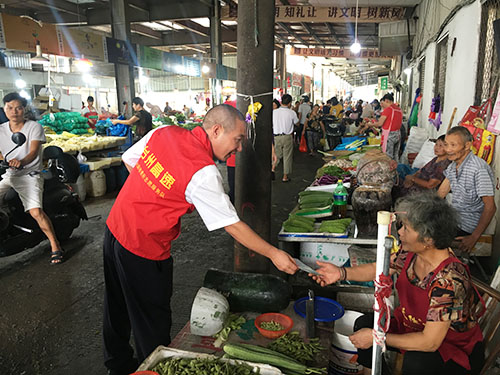 圖為志愿者在菜場宣傳垃圾分類 志愿者們特地選取菜市場、商鋪等人多且容易產生垃圾的地方,向店主和商販們宣講環境公害引發的負面后果及如何處理平時的生活垃圾,他們結合宣傳冊通俗、耐心地講解生活垃圾要從源頭開始分類投放:干濕要分開,對剩菜剩飯、瓜皮果殼等易腐垃圾要瀝干水分,投放后要蓋好垃圾桶,免得蚊蠅滋生;紙類、飲料瓶、金屬等有再生利用價值的要放在可回收的垃圾桶里;對電池、電子產品、殺蟲劑、油漆桶等含有害化學物質的要單獨放;剩余的作其它垃圾處理。