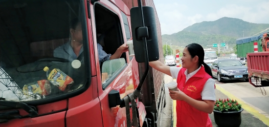圖為送清涼活動現場 “師傅,你好,喝一碗冰綠豆湯解解暑吧。” 溫嶺西收費所、大溪嶺隧道所黨員帶頭,團員響應,大家主動放棄休息時間,組成志愿服務隊,頂著高溫在高速出口處為過往司乘免費提供綠豆湯、紅棗湯等飲品,同時還備足藿香正氣水、風油精等解暑藥品,讓廣大司乘在炎炎夏日感受到一絲清涼。當司乘人員從志愿者手中接過一杯杯綠豆湯時,志愿者還不忘提醒司乘高溫酷暑天氣注意行車安全。面對“春風”般微笑的志愿者,喝著綠豆湯的司乘人員都露出了開心的笑容,紛紛豎起大拇指感謝志愿者們的貼心服務。