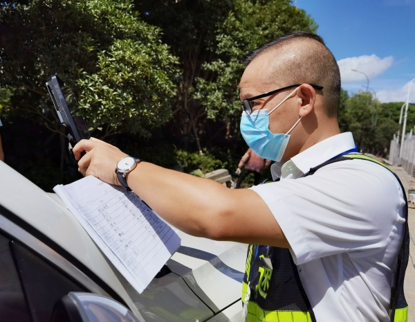 這是征費四班班長鄭星和駕駛員的對話,他手持iPad,不停地在屏幕上滑動著、查詢著。天氣炎熱,大貨車開車時較為顛簸,3M膠軟化黏不牢,ETC設備容易脫落。ETC設備一旦掉落,則會提示“標簽已失效”,就無法正常工作,不能實現不停車出入高速公路ETC車道,給來往司機和收費人員增添了很多麻煩。為全力配合ETC服務需要,鄭星冒著酷暑高溫,不厭其煩地幫著司乘人員解決問題,一天下來工作服濕了又干,干了又濕,他就是臺州高速上的最美堅守者。
