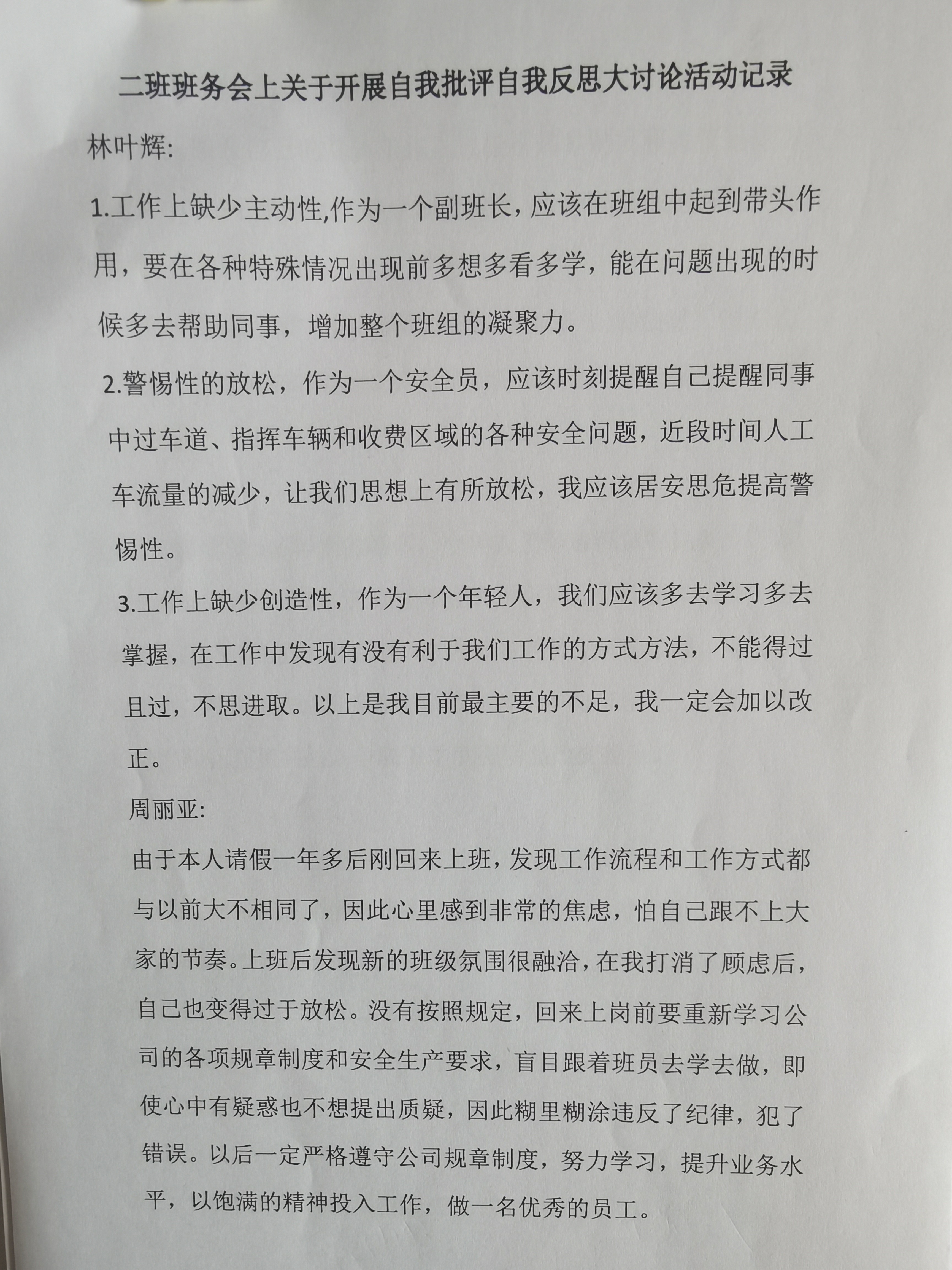 在討論中,大家圍繞自己在思想、學習、工作等方面情況,深挖自己的缺點和不足,直面自己的“短”處,并分析原因,拿出解決辦法,然后明確接下去努力的方向。具體問題包括:工作上缺乏主動性和創造性,工作態度情緒化;存在得過且過、不思進取的思想;對自己要求不嚴,遇事強調客觀理由;隨著車流量的減少,安全警惕性也有所下降等等。