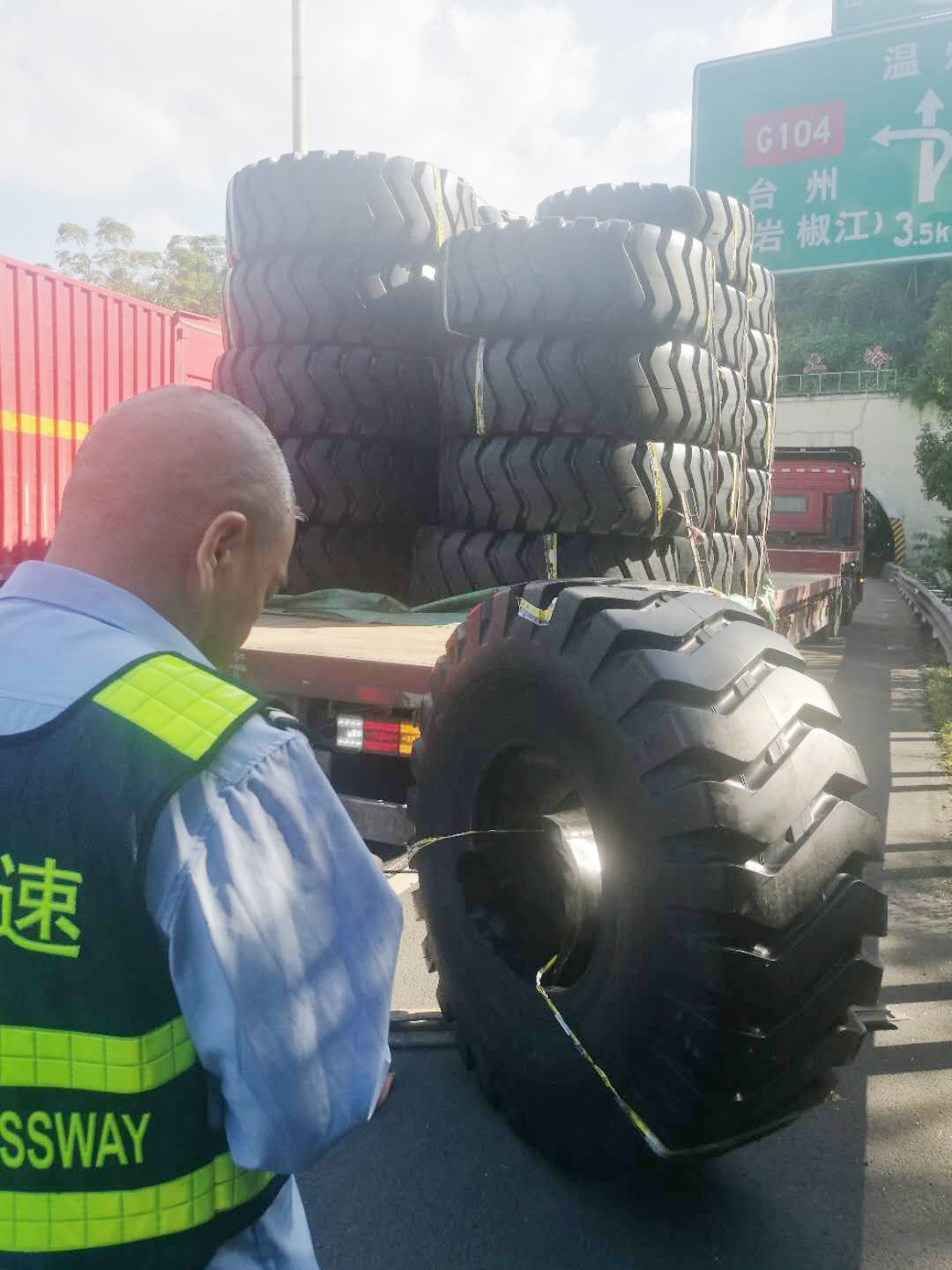 執勤隊接警后立即趕往事故地點,一輛運載輪胎的貨車??吭谥鬈嚨?,其中一個巨型輪胎滑落到硬路肩上,致使后方車輛紛紛避讓。為及時消除險情,執勤隊快速在現場做好安全警戒工作,同時將現場情況反饋給監控中心。由于貨車綁繩索松動,重達300多斤的輪胎脫落在地,隨后執勤隊協同施救中心、駕駛人員合力將掉落的輪胎先拖至車旁,經過長達半個小時的搶險,跌落的貨物終于完好無缺地回到貨車上,道路恢復暢通。 筆者溫馨提醒:在高速公路行駛過程中,駕駛人應注意將車上的貨物固定好,途中要隨時注意貨物及捆綁繩索是否松動。無論是車輛撒落物還是人為拋灑物,都會給道路安全暢通埋下了重大隱患! 林玲