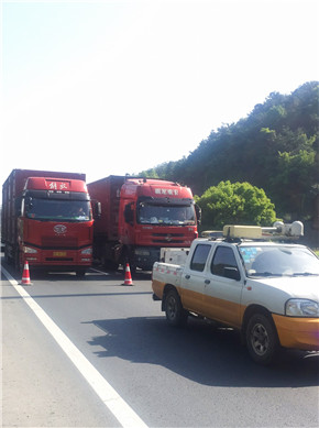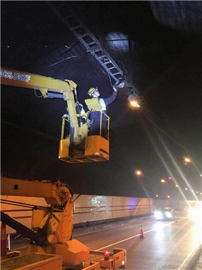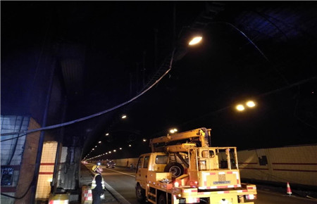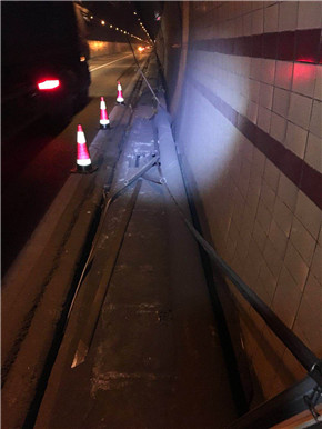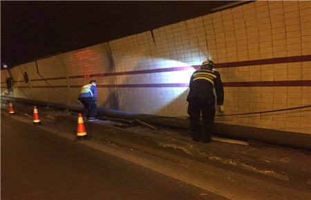 此時此刻,維養中心值班同志已經馬不停蹄地奔往現場,中心負責人從臨海速度趕往現場。經檢查,掛落電纜系汽通門控制線,不影響隧道內照明、通訊系統的正常運行。當機立斷,決定采取臨時加固的緊急措施,及時聯系協調交警部門,請求封道施工的幫助和支持。