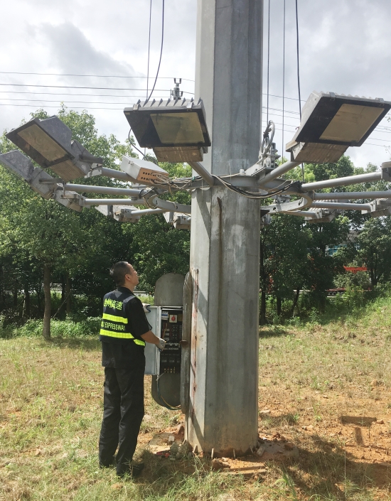 圖為工作人員下降各收費所互通區高桿燈 增強機電設備防水措施。集團收費站有很多機電設備直接安裝在戶外,因外層有開關柜保護,一般雨水是無法滲透的??梢坏┯錾吓_風雨等惡劣天氣就很難確保內部設備不會被打濕,尤其是計量柜里面的計重設備,一旦短路損壞會立即造成車輛擁堵。因此,剛完成高桿燈下降工作的中心隊員顧不上休息,又馬不停蹄趕赴收費所將計量柜、欄桿機等重要設備用封帶紙進行密封處理,不漏過任何一處可能進水的地方,大大增強了這些設備防水性能。
