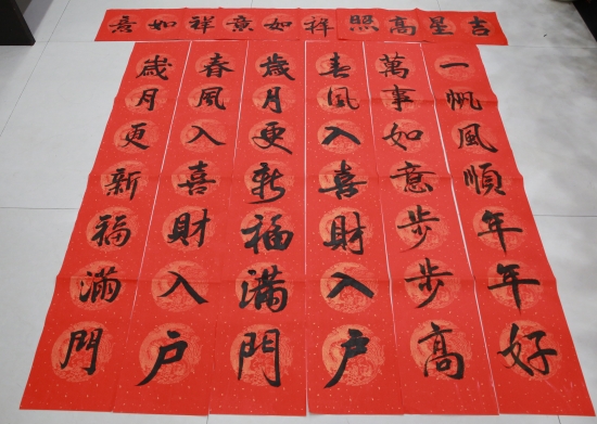 圖為學員學習寫書法 本次活動由集團辦公室牽頭組織,以集中書寫和分開書寫相結合的方式進行。參與者在百忙之中抽出自己的業余時間,積極參與到活動中來,共同書寫500多幅春聯作品。春節臨近,集團全體員工和集團兩個結對村的100戶村民都將收到暖暖的“送春聯”祝福。 當日集中書寫現場,參與者們認真埋頭書寫,并不時地相互請教學習。有的下筆蒼勁有力、筆精墨妙,有的如行云流水一筆而下,有的力透紙背,一個個大字很快躍然紙上。