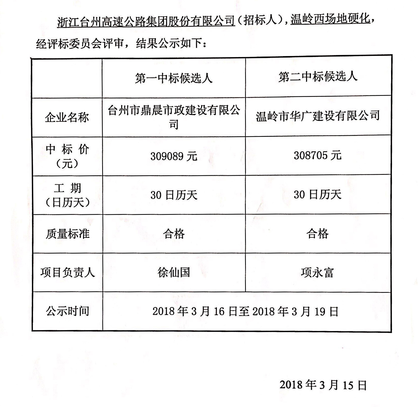 溫嶺西場地硬化工程中標候選人公示單