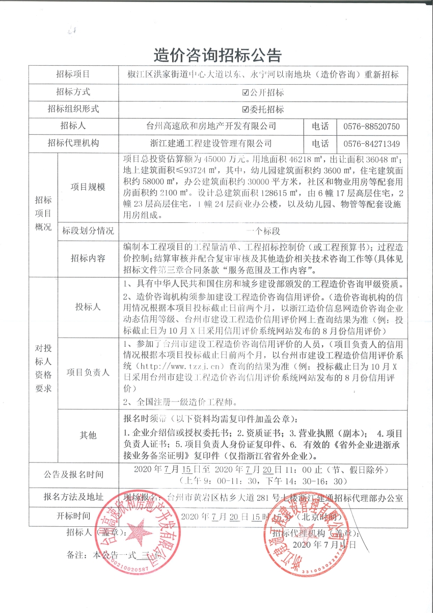 椒江區洪家街道中心大道以東、永寧河以南地塊(造價咨詢)重新招標公告