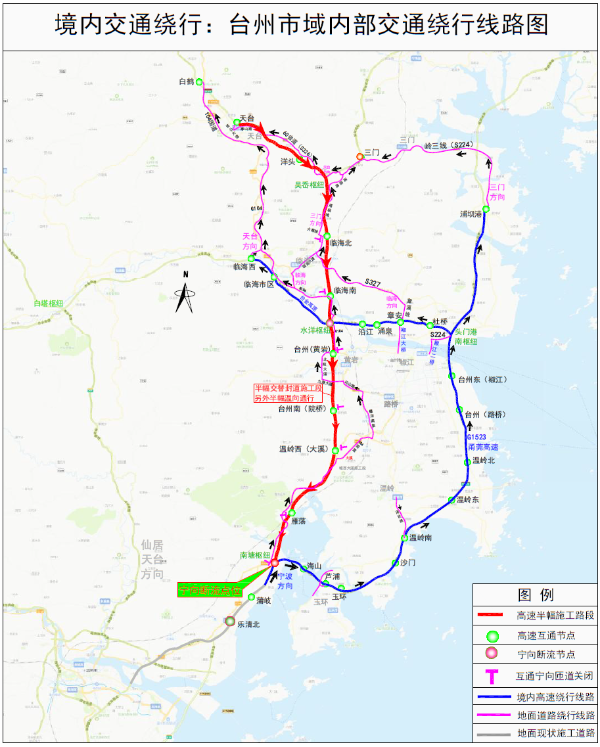 屆時雁蕩、溫嶺西(大溪)、臺州南(院橋)、臺州(黃巖)寧波方向關閉14天,臨海南、臨海北互通寧波方向進口關閉7天,洋頭互通上虞方向進口關閉7天,所有車輛禁止上高速;溫州方向進出口將根據改道需要臨時關閉。