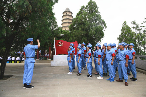 圖為黨員在梁家河合影 不顧前一天的舟車勞頓,第二天一大早,黨員們整裝出發,在紅色旗幟引領下,頂著烈日,一路步行到達寶塔山山頂?!笆肿S土我不放,緊緊兒貼在心窩上。幾回回夢里回延安,雙手摟定寶塔山?!本C合支部的小周對著寶塔山,情不自禁地大聲誦讀起賀敬之的《回延安》。黨員們在巍巍寶塔下高舉右拳,用鏗鏘有力的聲音宣讀了入黨誓詞,對于大家來說,重溫入黨誓詞是共產黨員表達自己為共產主義奮斗終生的最佳方式,黨員們的心靈再次受到震撼和洗禮。